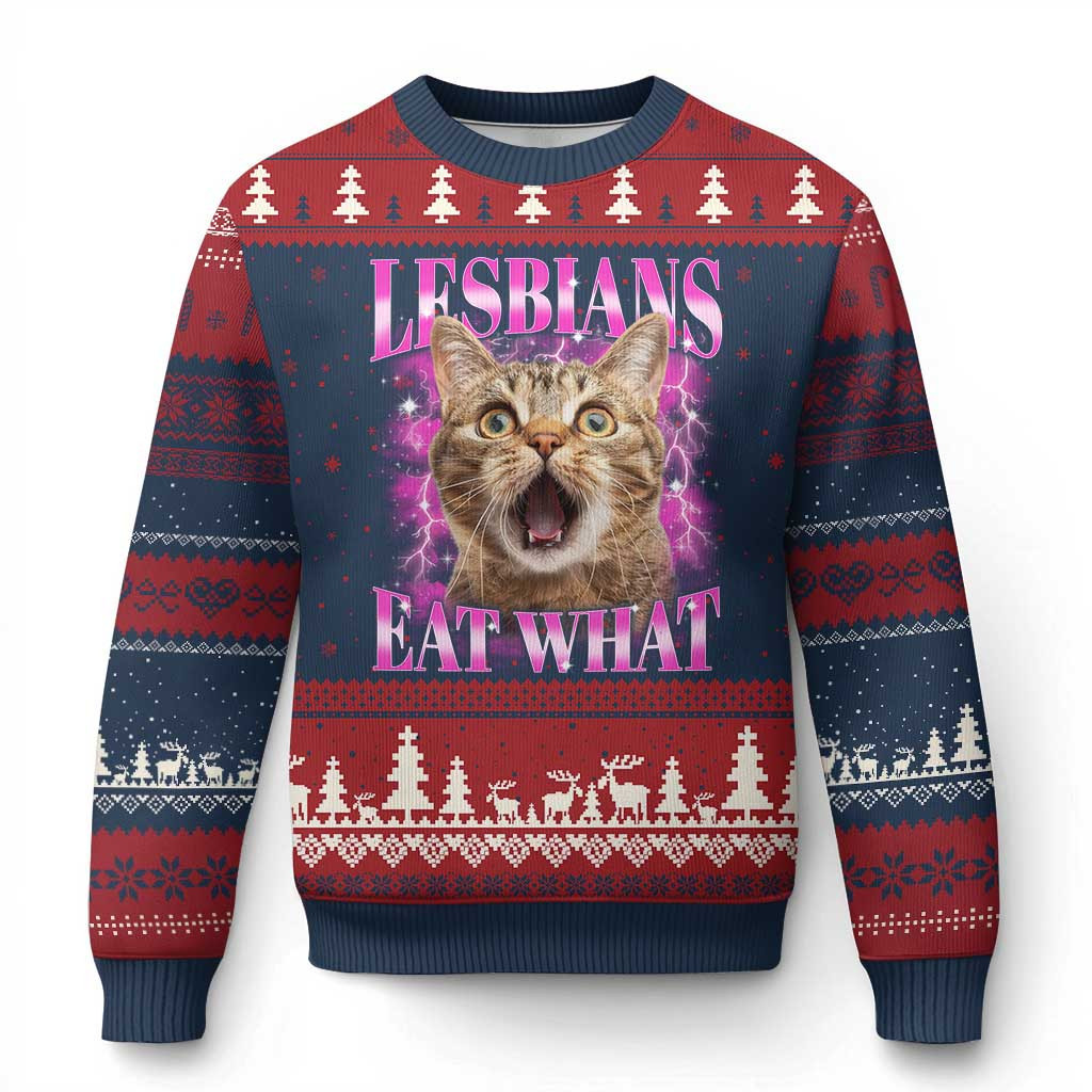 Rushgleam Lesbians Eat What Ugly Christmas Sweater Funny Cat Gay Pride LGBTQ Pun Christmas Clothing