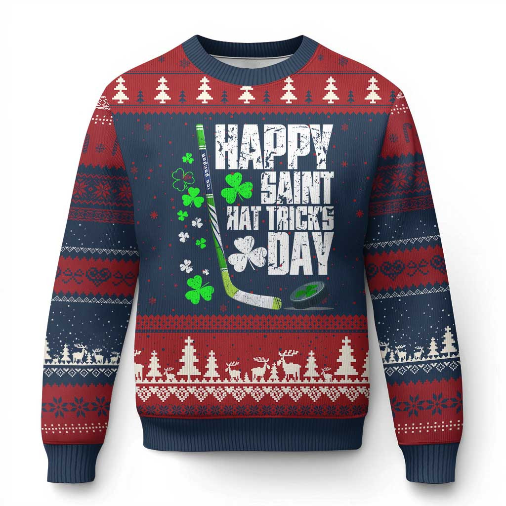 Rushgleam Lucky Shamrocks Ice Hockey Ugly Christmas Sweater Happy Saint Hat Tricks Day Gift For Her