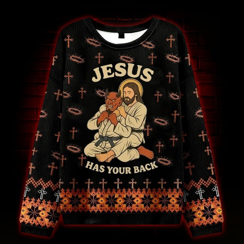 Jesus Has Your Back Ugly Christmas Sweater Jiu Jitsu Print Pullover Funny Jesus Xmas Gifts