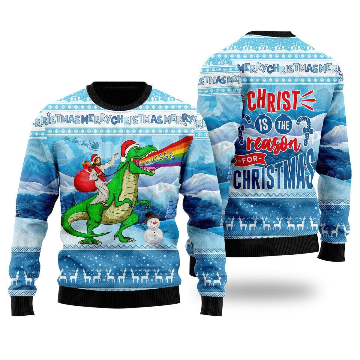 Jesus Riding A Dinosaur Ugly Christmas Sweater Christ Is The Reason Religious Gifts For Xmas