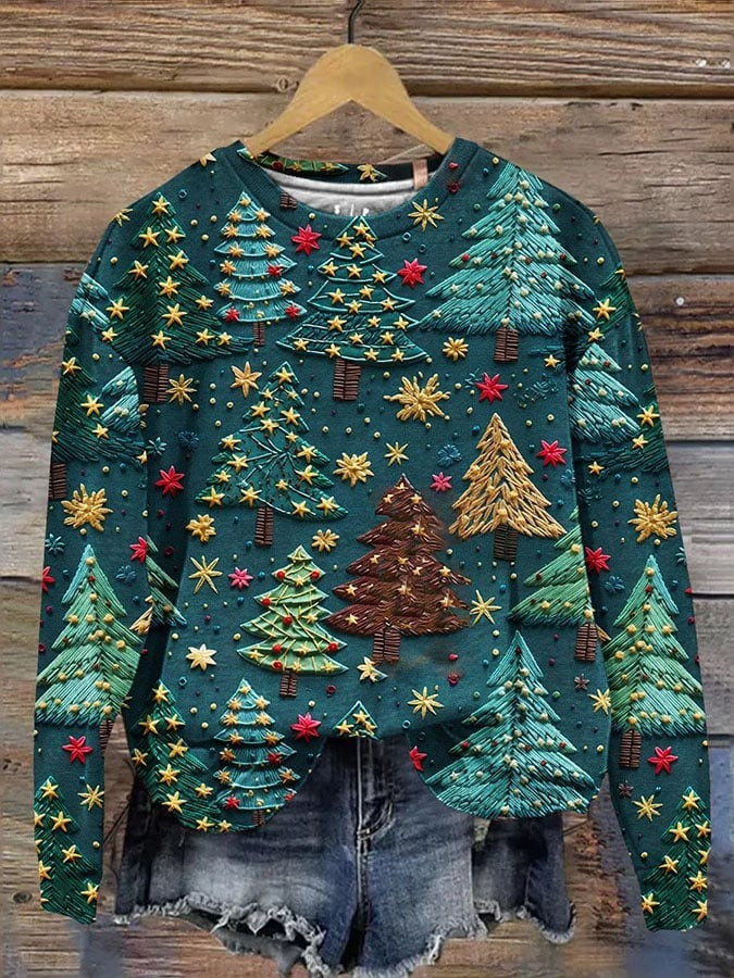 Pine Tree Christmas Sweatshirt Festive Holiday With Stars And Colorful Trees Merch Gifts