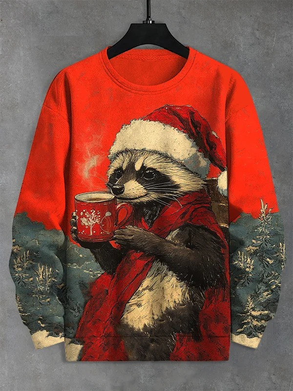Raccoon Drinking Hot Tea Christmas Holiday Sweatshirt Cute Clothes Gifts For Raccoon Lovers