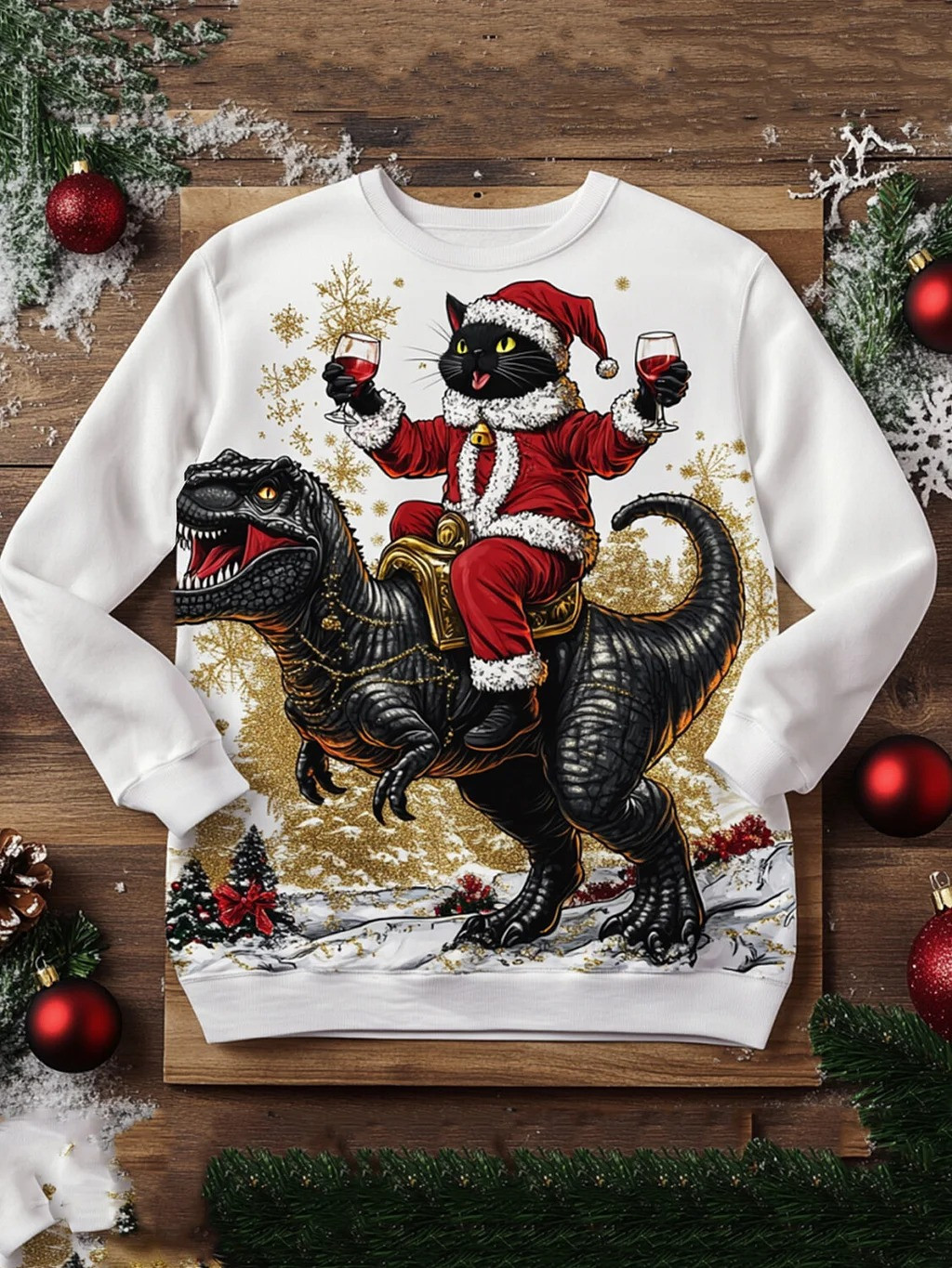 Black Cat Riding Dinosaur Holding Wine Christmas Holiday Sweatshirt Xmas Gifts For Cat Lovers