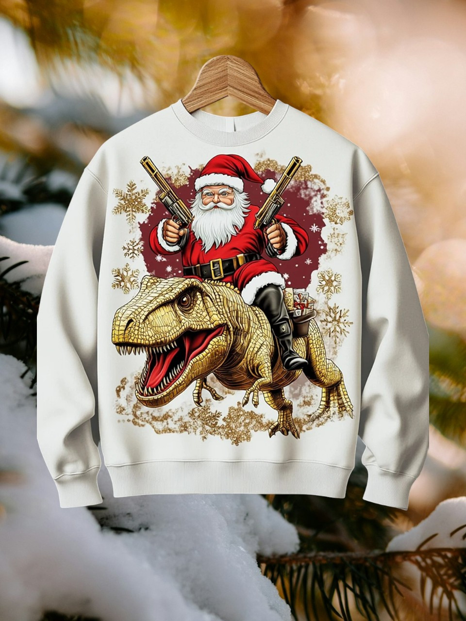 Santa Riding T-Rex Christmas Sweatshirt Santa With Dual Pistols Dinosaur Themed Gifts