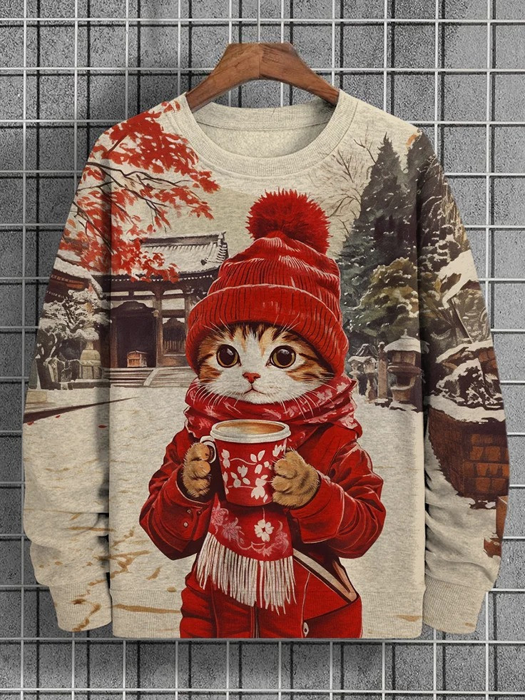 Cat With Coffee Christmas Holiday Sweatshirt Cozy Winter Christmas Gifts For Cat Owners