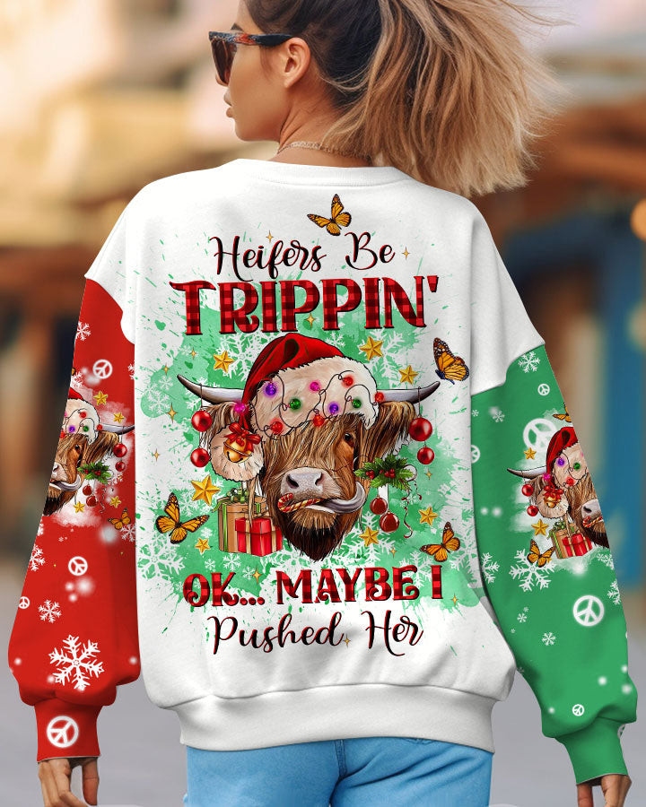Cow Wearing Santa Hat Sweatshirt Heifers Be Trippin’ Christmas Clothing Cow Lover Gift Ideas