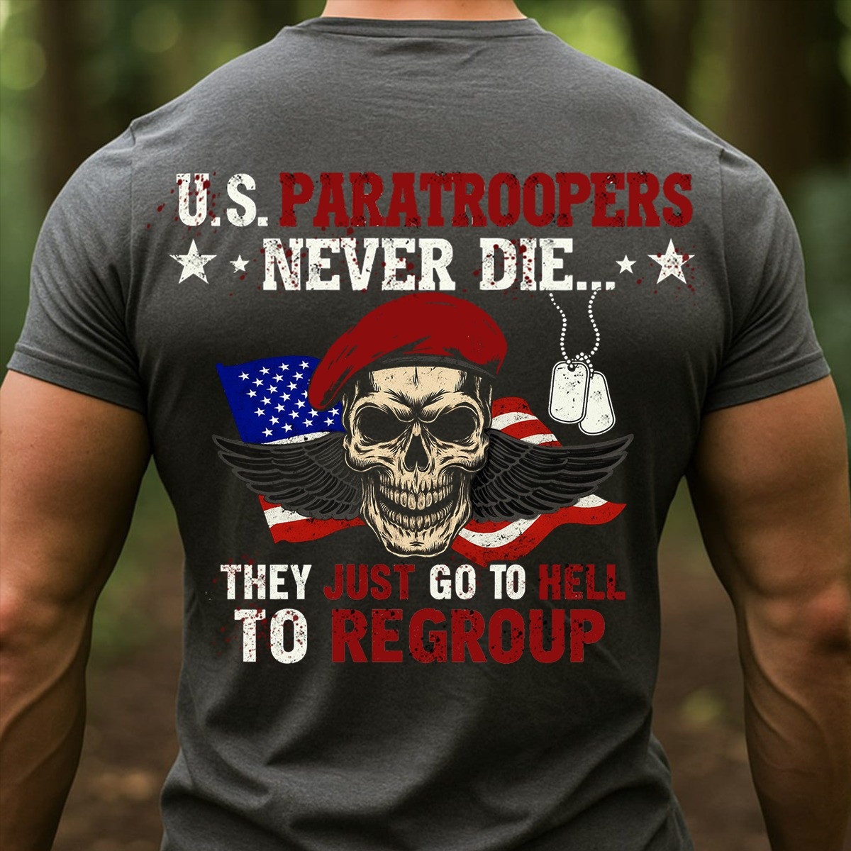 $29.99 – $35.99Price range: $29.99 through $35.99Skull U.S. Paratroopers Never Die T-Shirt Dog Tags USA Flag To Regroup Veteran Shirt Gifts