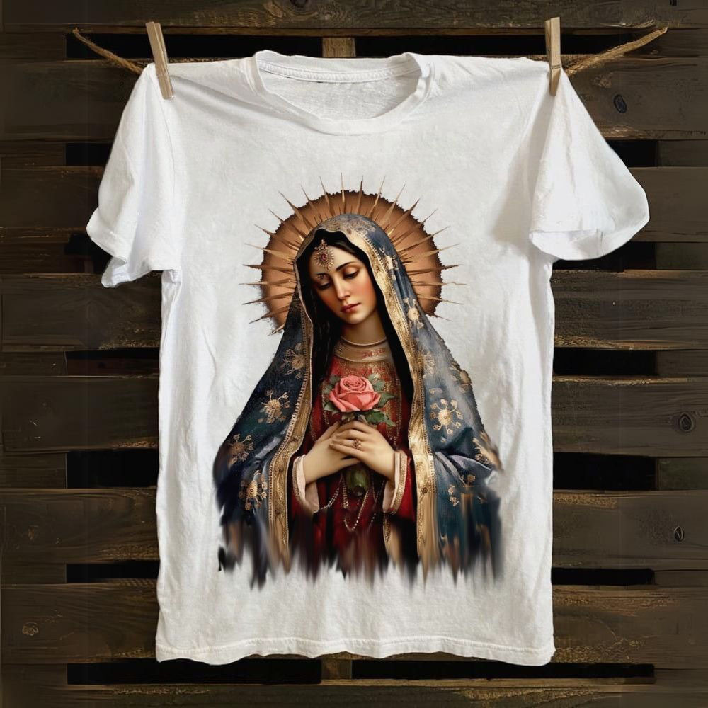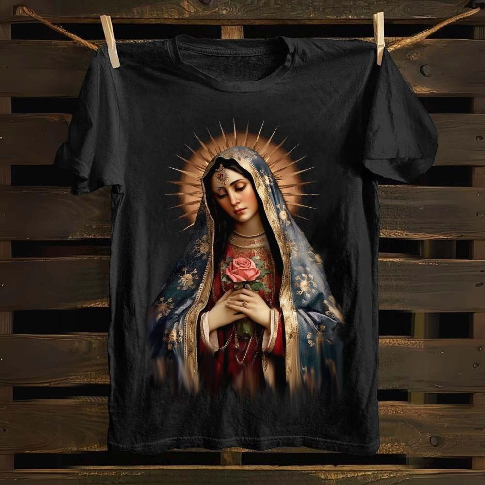 $29.99 – $35.99Price range: $29.99 through $35.99Virgin Mary Queen of the Rosary Tee Sacred Rose Artwork Religious Christmas Present