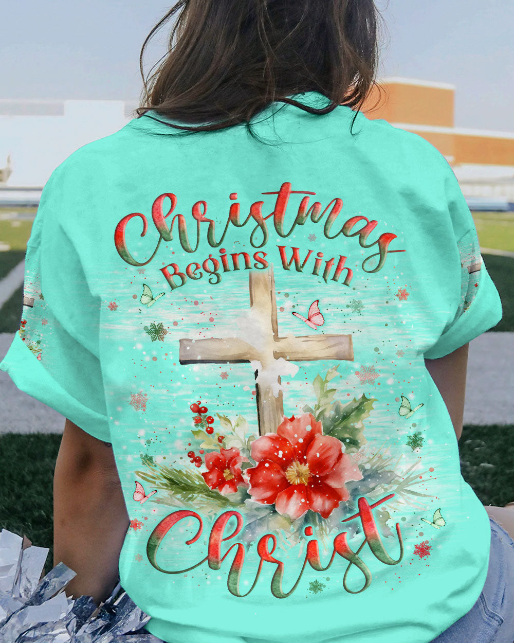 Rushgleam Cross Christmas Begins With Christ T-Shirt Christian Holiday Clothing Jesus Christ Gifts