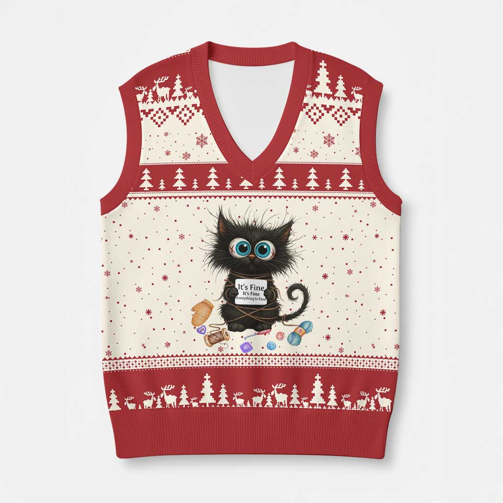 Rushgleam Black Cat Ugly Christmas V-Neck Knit Sweater Meaning Vest I’m Fine Gift For Women
