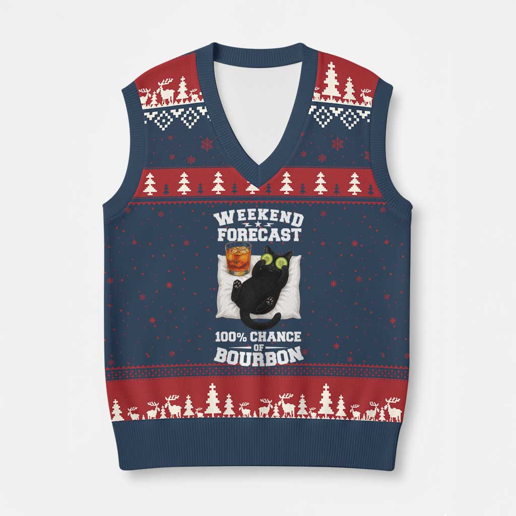 Rushgleam Black Cat Weekend Forecast Ugly Christmas V-Neck Knit Sweater Vest Gift Lover Cat
