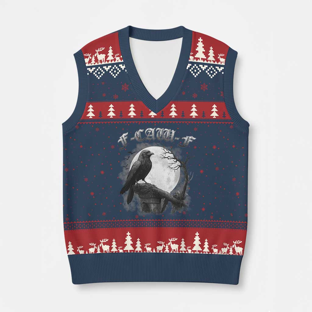 Rushgleam Black Crow F-Caw-F Ugly Christmas V-Neck Knit Sweater Funny Raven Gothic Gift For Adult