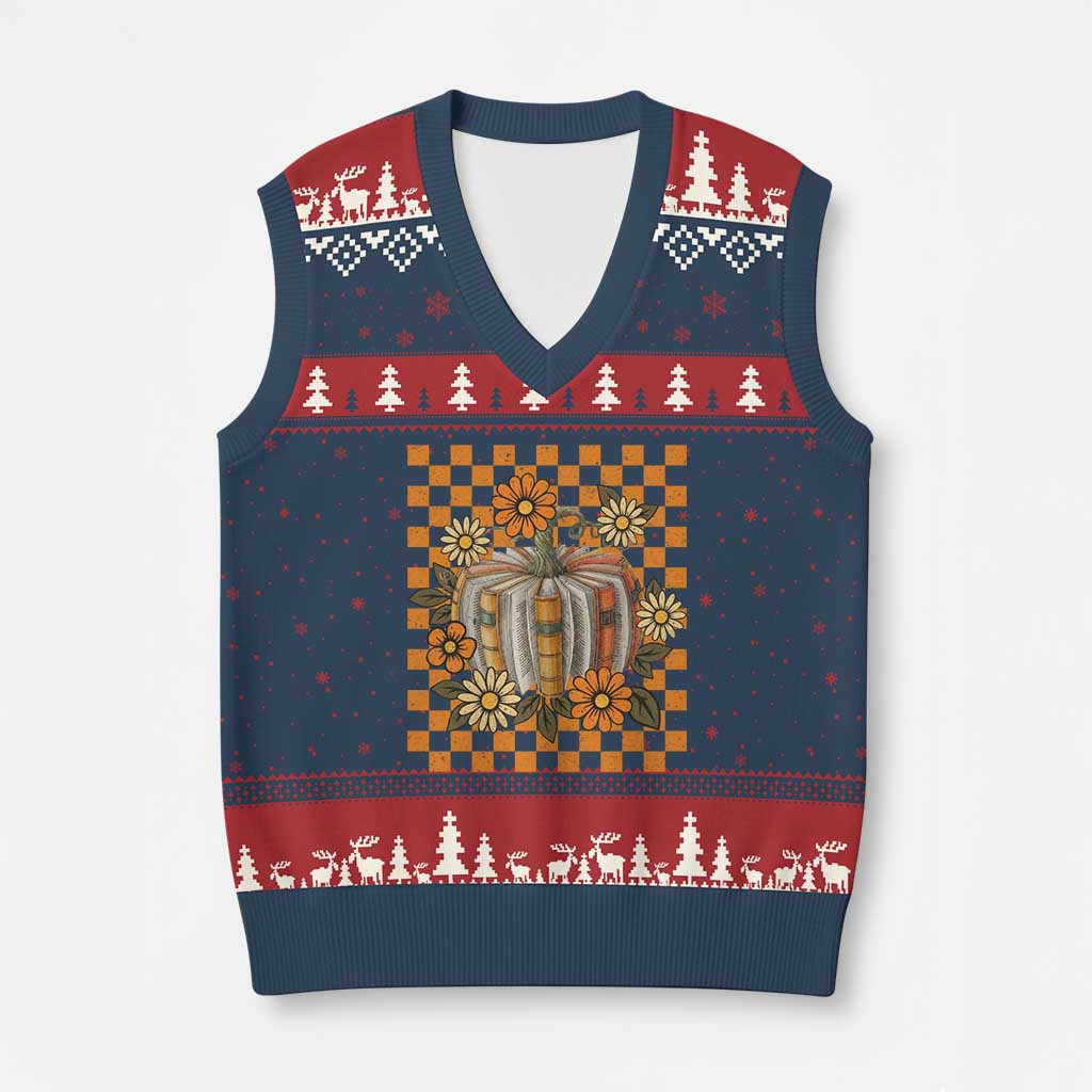 Rushgleam Book Pumpkin Ugly Christmas V-Neck Knit Sweater Vest Fall Halloween Gift For Bookish Lover
