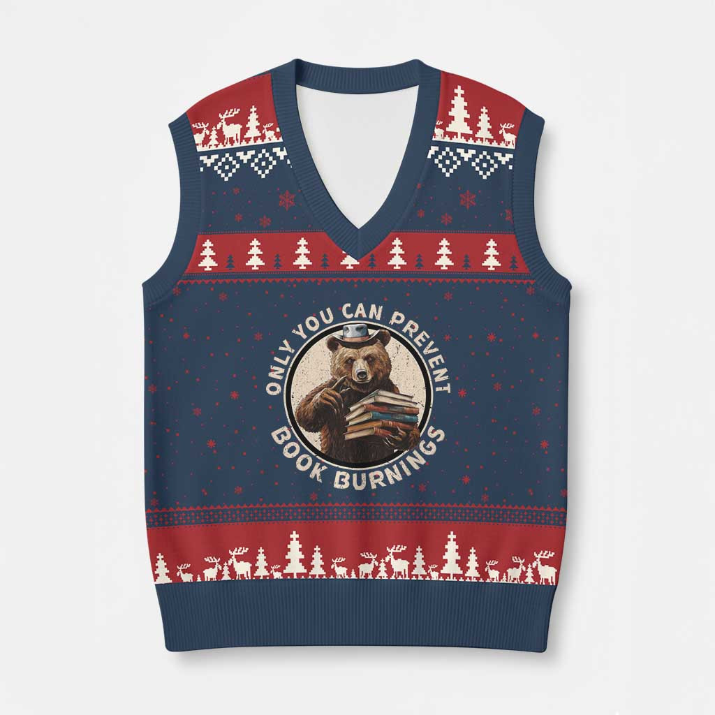 Rushgleam Books Lover Bear Ugly Christmas V-Neck Knit Sweater Vest Can Prevent Gift For Book Lover