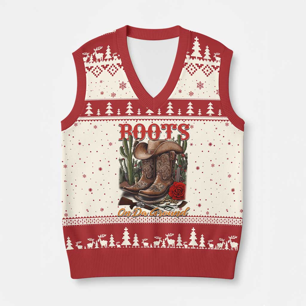 Rushgleam Boots On The Ground Ugly Christmas V-Neck Knit Sweater Gift For Cowboy Lovers