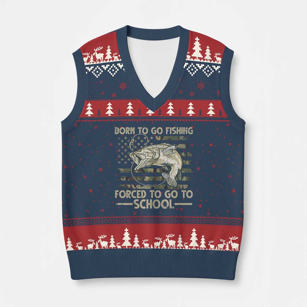 Rushgleam Born To Go Fishing Ugly Christmas V-Neck Knit Sweater Vest Funny Gift Ideas For Fisherman