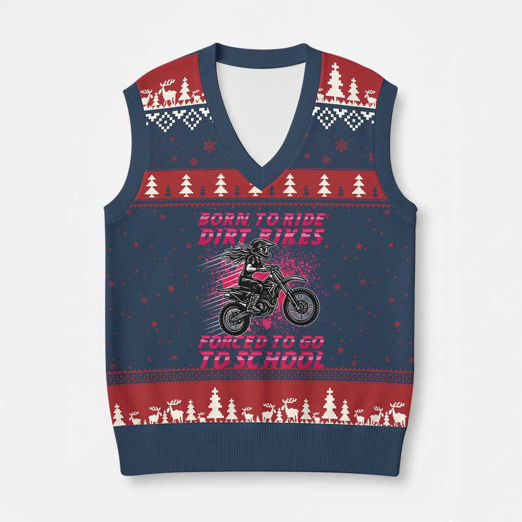 Rushgleam Born To Ride Dirt Bikes Ugly Christmas V-Neck Knit Sweater Vest Gift For Girl Who Loves Ride