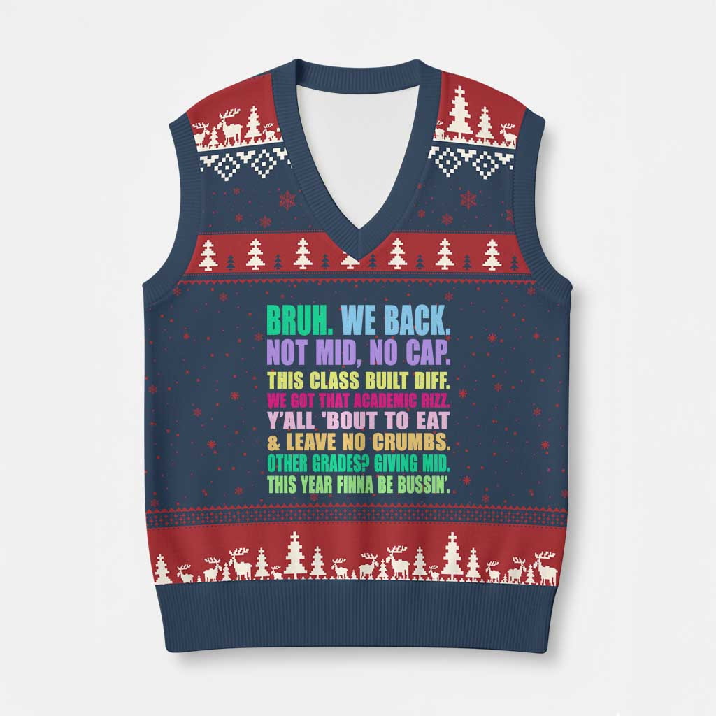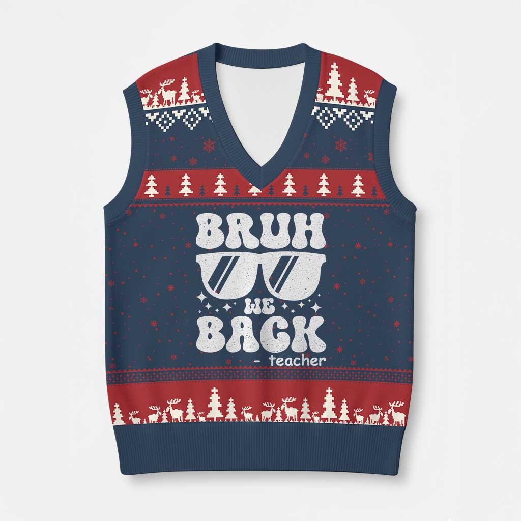 Rushgleam Bruh We Back Teacher Ugly Christmas V-Neck Knit Sweater Vest Funny Back To School Gift Ideas