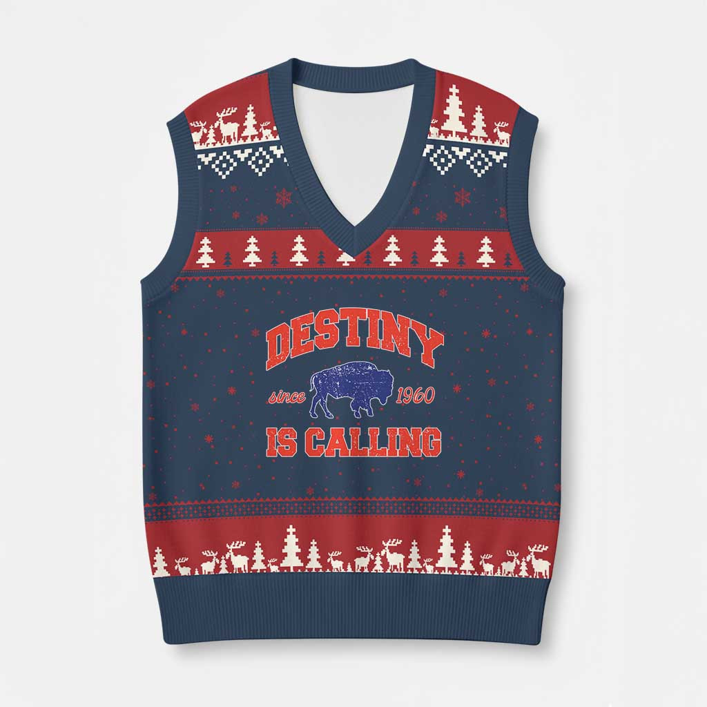 Rushgleam Buffalo Destiny Is Calling Ugly Christmas V-Neck Knit Sweater Vest Best Gift For Buffalo Fan