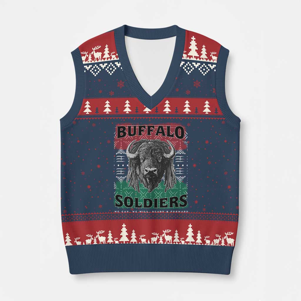 Rushgleam Buffalo Soldiers Ugly Christmas V-Neck Knit Sweater Vest Heroes Black Soldiers Gift For Dad