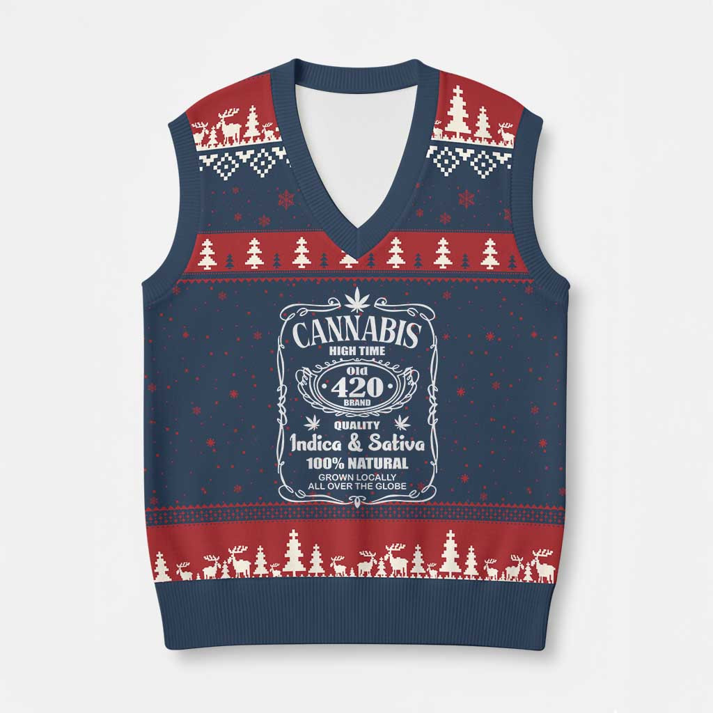 Rushgleam Cannabis High Time Ugly Christmas V-Neck Knit Sweater Vest Old 420 Luxury Gifts For Women