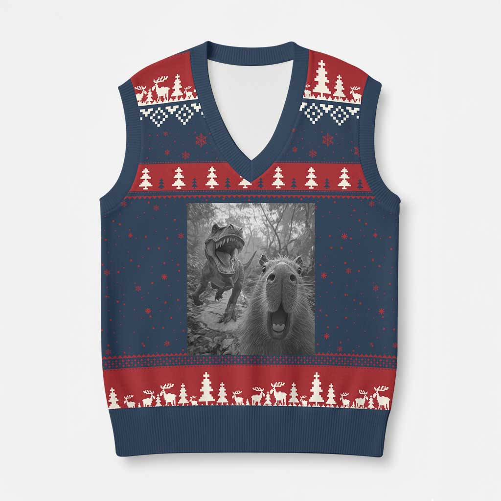 Rushgleam Capybara Selfie With Dinosaur Ugly Christmas V-Neck Knit Sweater Vest Humor Clothing Gift