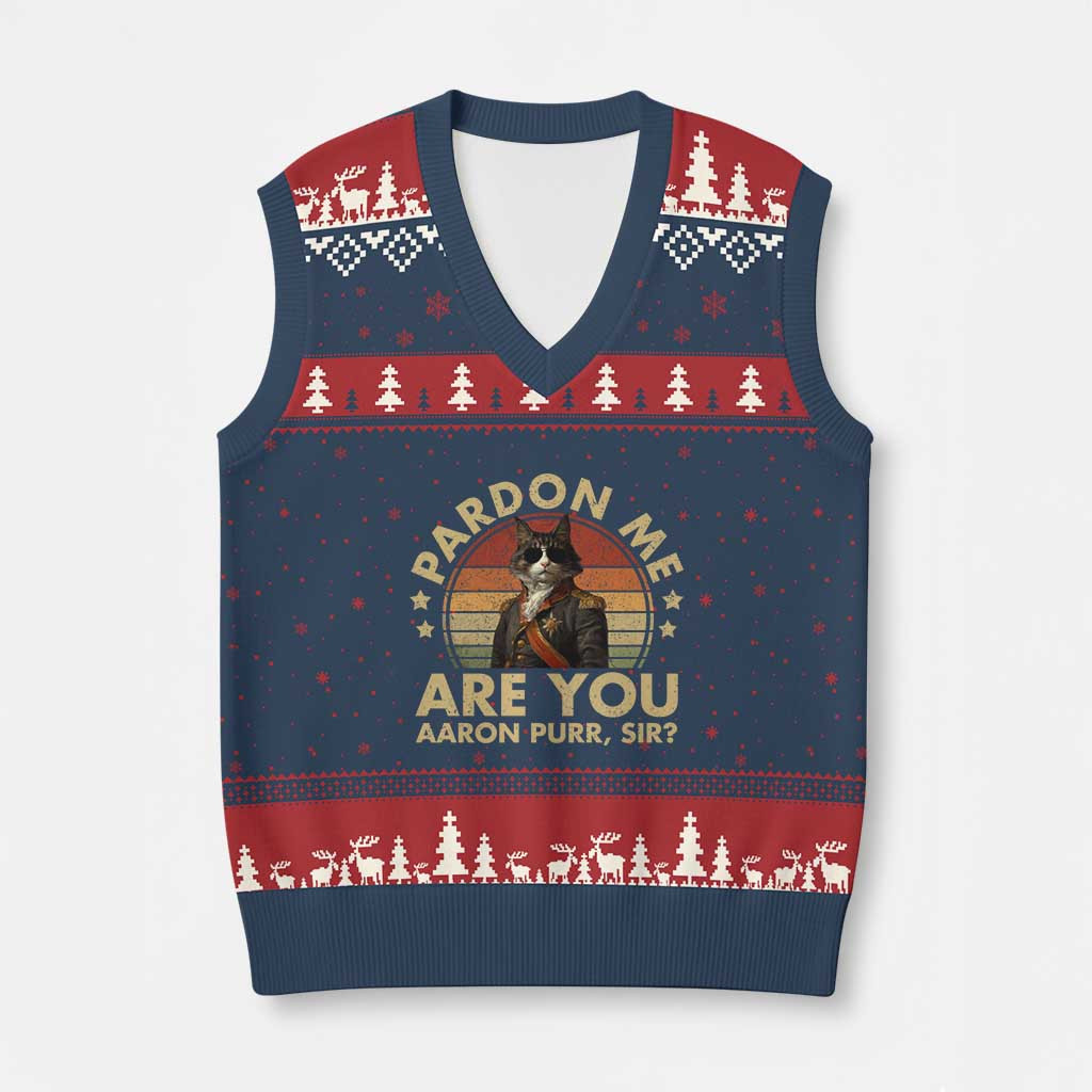 Rushgleam Cat Alexander Hamilton Ugly Christmas V-Neck Knit Sweater Vest Funny Gifts For Cat Lovers
