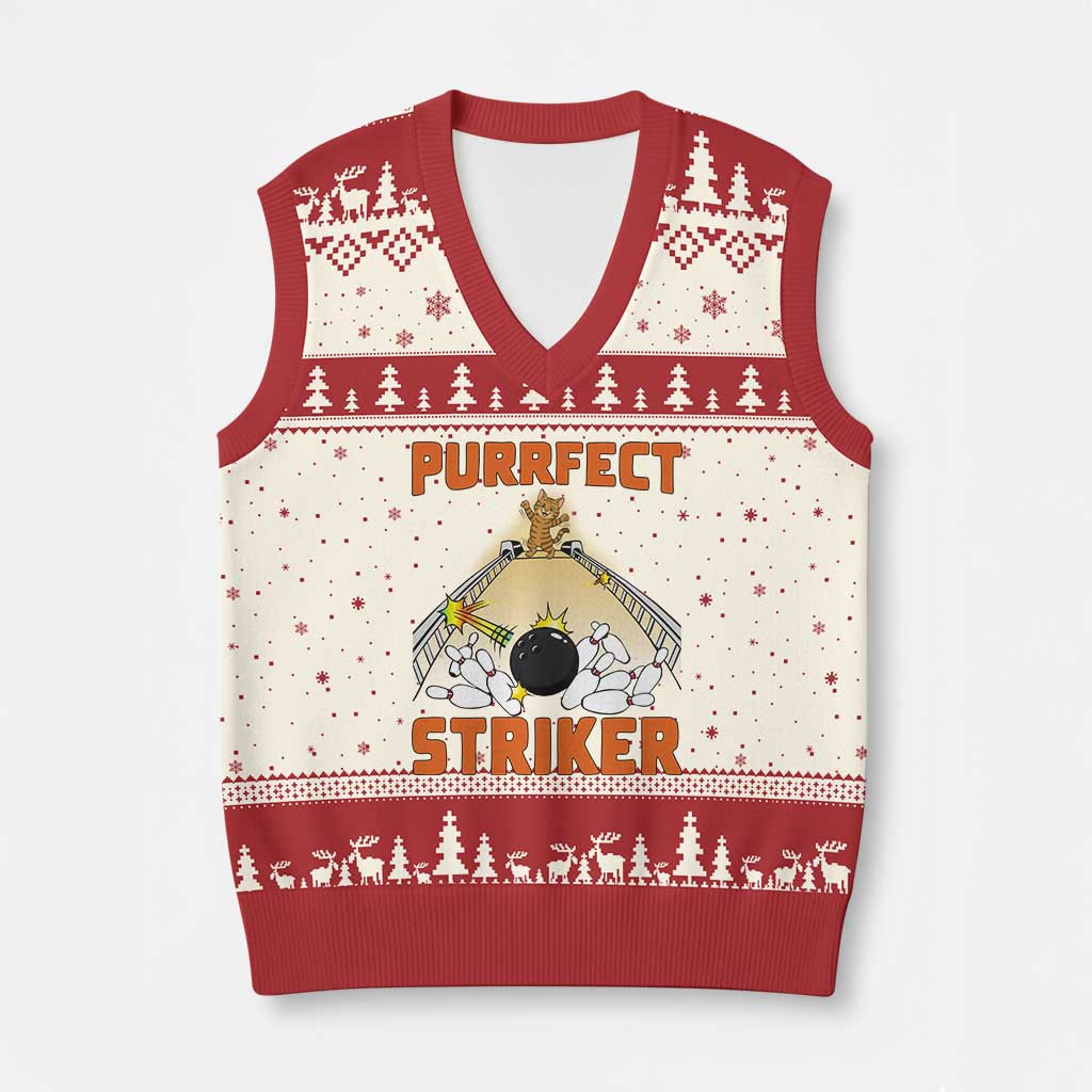 Rushgleam Cat Bowling Ugly Christmas V-Neck Knit Sweater Vest Purrfect Striker Cool Christmas Gifts