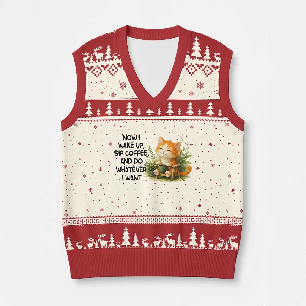 Rushgleam Cat Coffee Ugly Christmas V-Neck Knit Sweater Now I Wake Up Sip Coffee Gift For Cat Lover