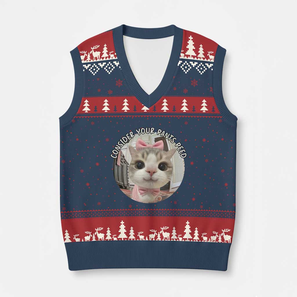 Rushgleam Cat Consider Your Pants Peed Ugly Christmas V-Neck Knit Sweater Vest Funny Cat Meme Apparel