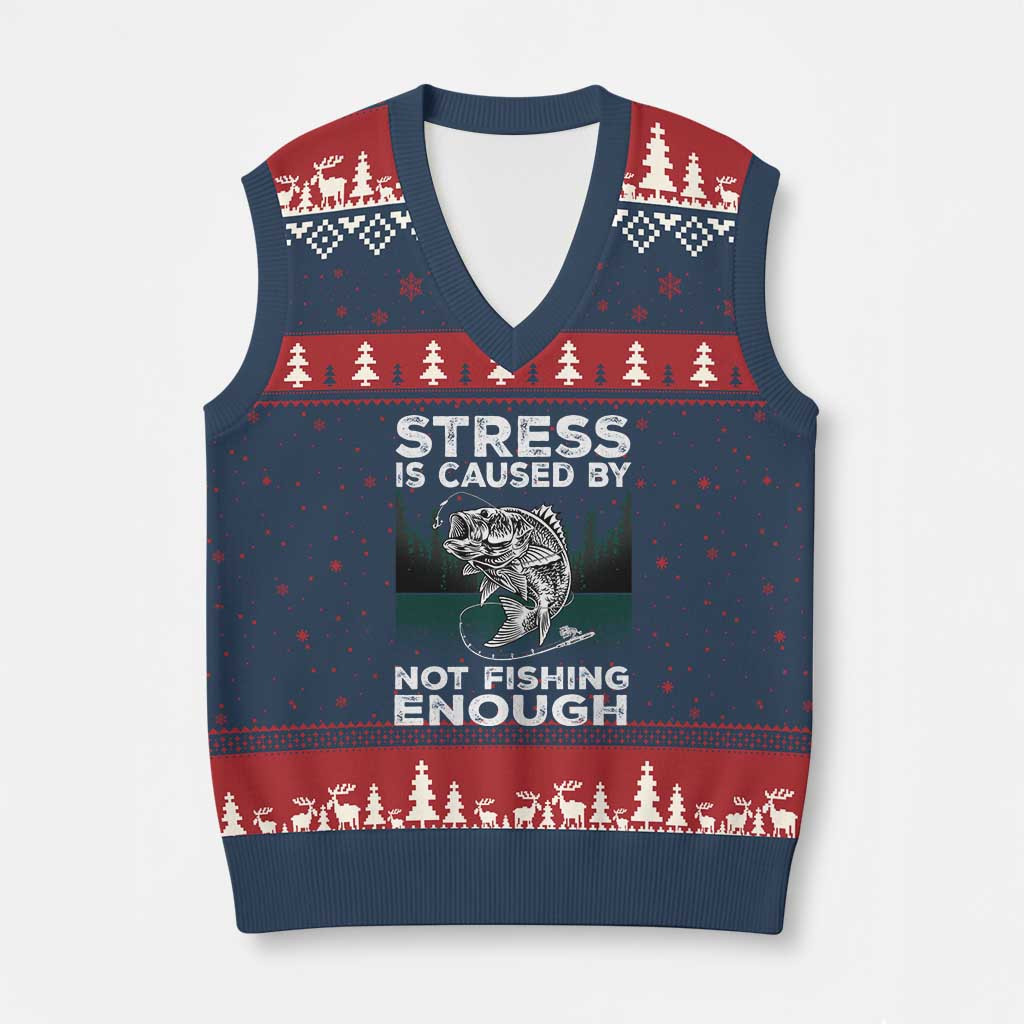 Rushgleam Fishing Ugly Christmas V-Neck Knit Sweater Vest Stress Is Caused By Not Fishing Enough Gift