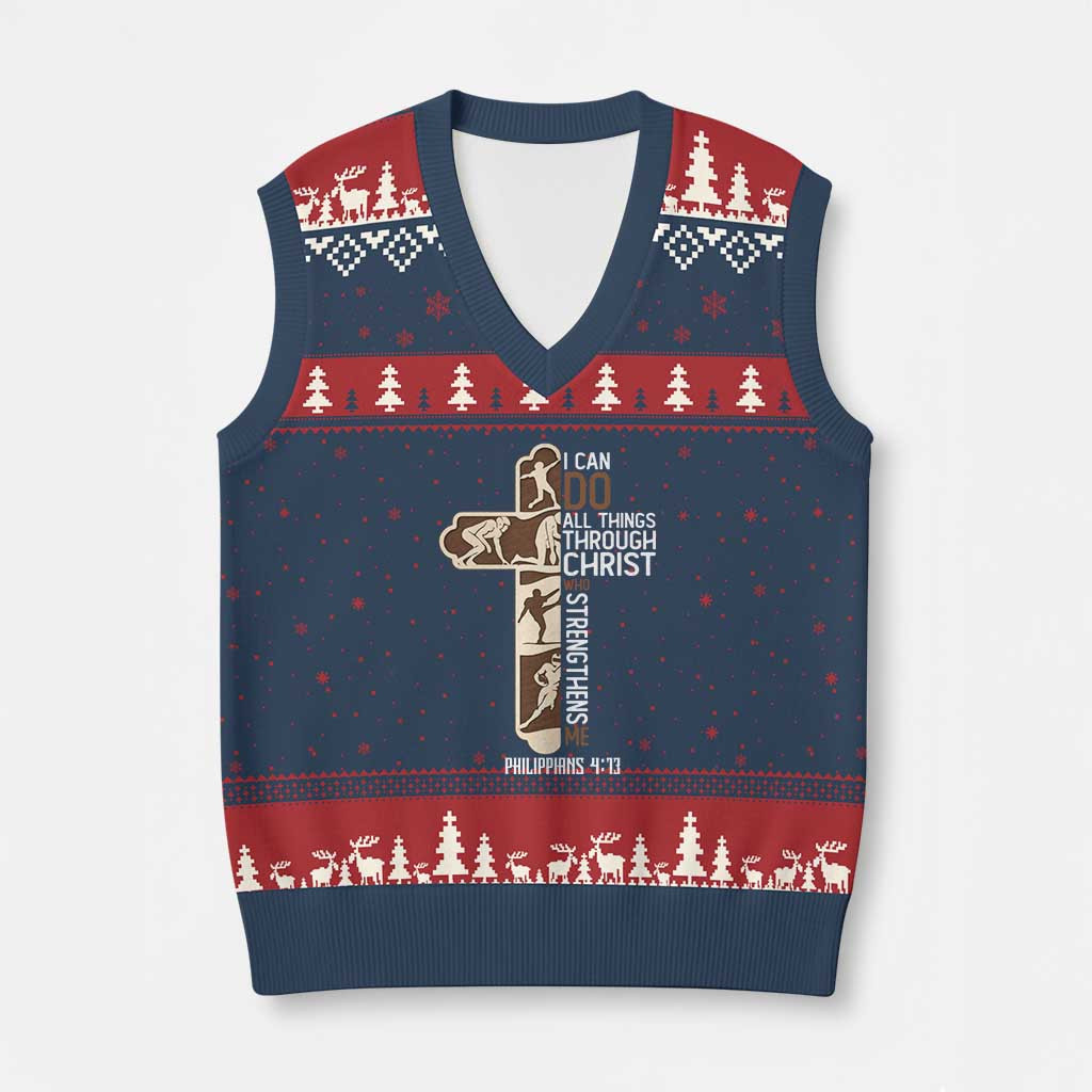 Rushgleam God Gives Me Strength Ugly Christmas V-Neck Knit Sweater Vest Best Football Player Gift