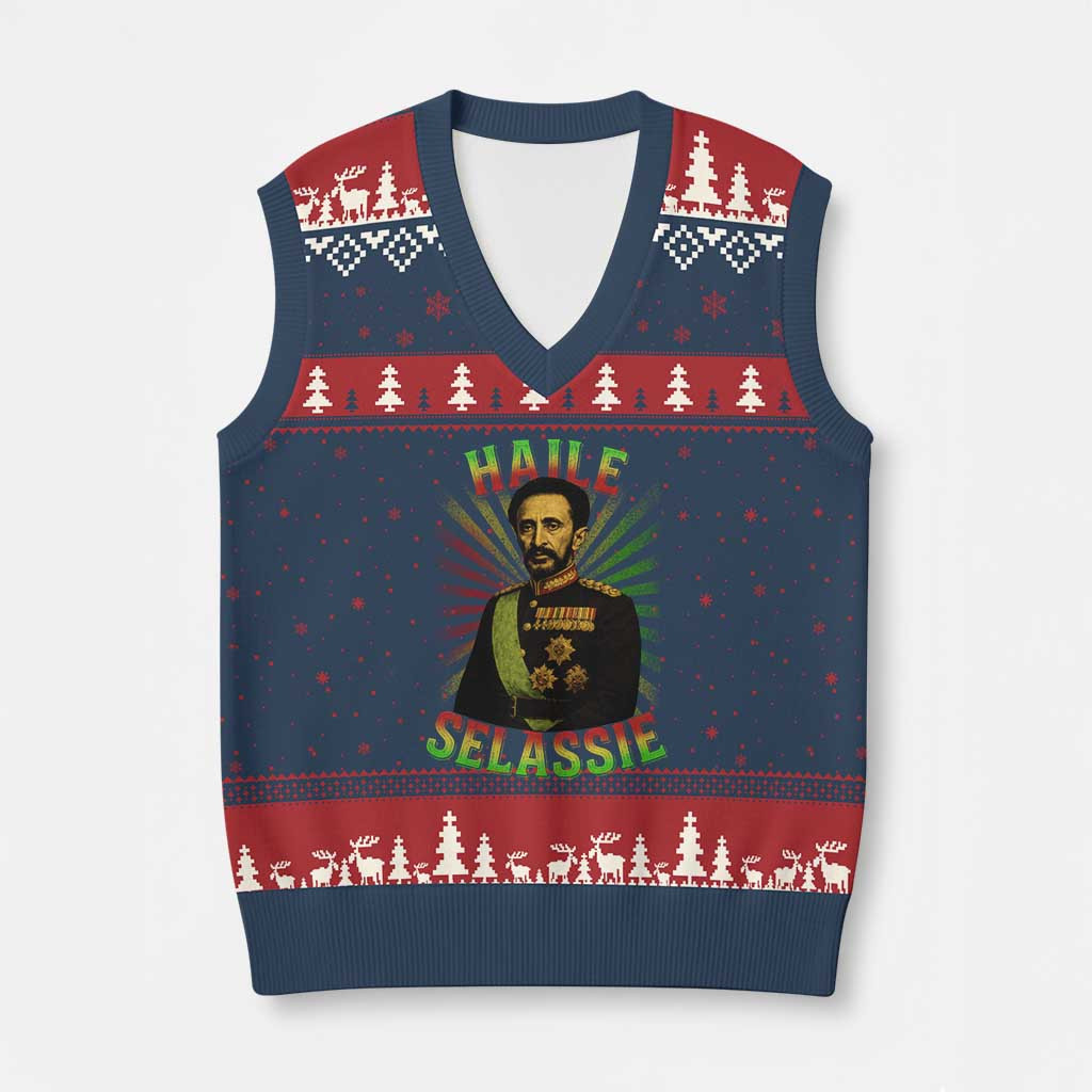 Rushgleam Haile Selassie Ugly Christmas V-Neck Knit Sweater Vest Ras Tafari Majesty Gift For Families