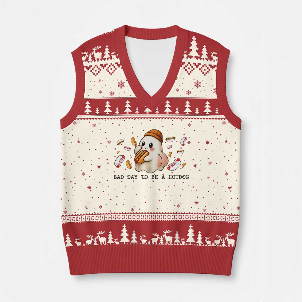Rushgleam Hot Dog Ghost Ugly Christmas V-Neck Knit Sweater Vest Bad Day To Be A Hot Dog Cute Kid Gift