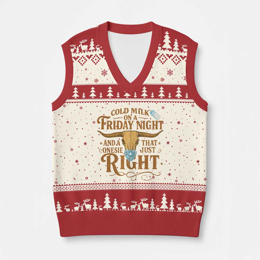 Rushgleam Longhorn Cow Cold Milk On A Friday Night Ugly Christmas V-Neck Knit Sweater Vest Skull Gift