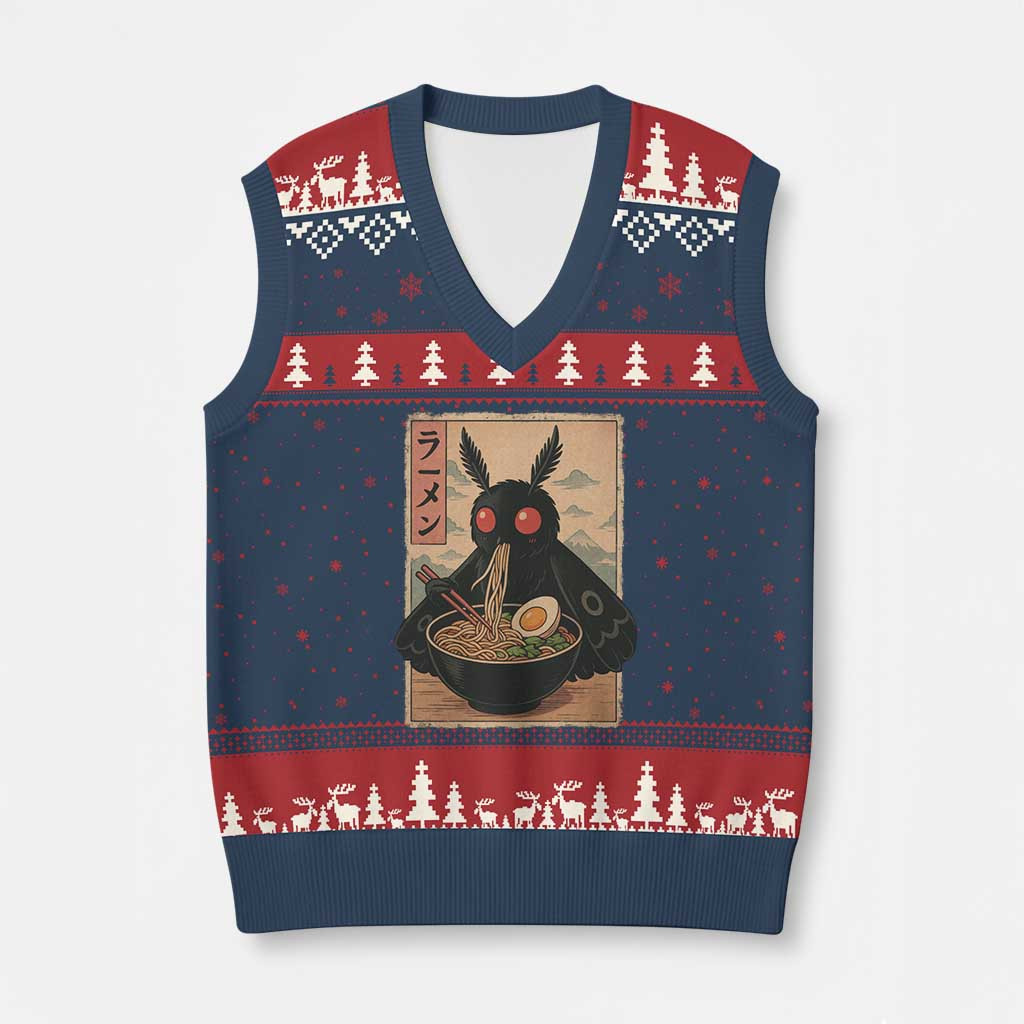 Rushgleam Mothman Ramen Ugly Christmas V-Neck Knit Sweater Vest Japanese Noodles Cryptid Gift For Kid