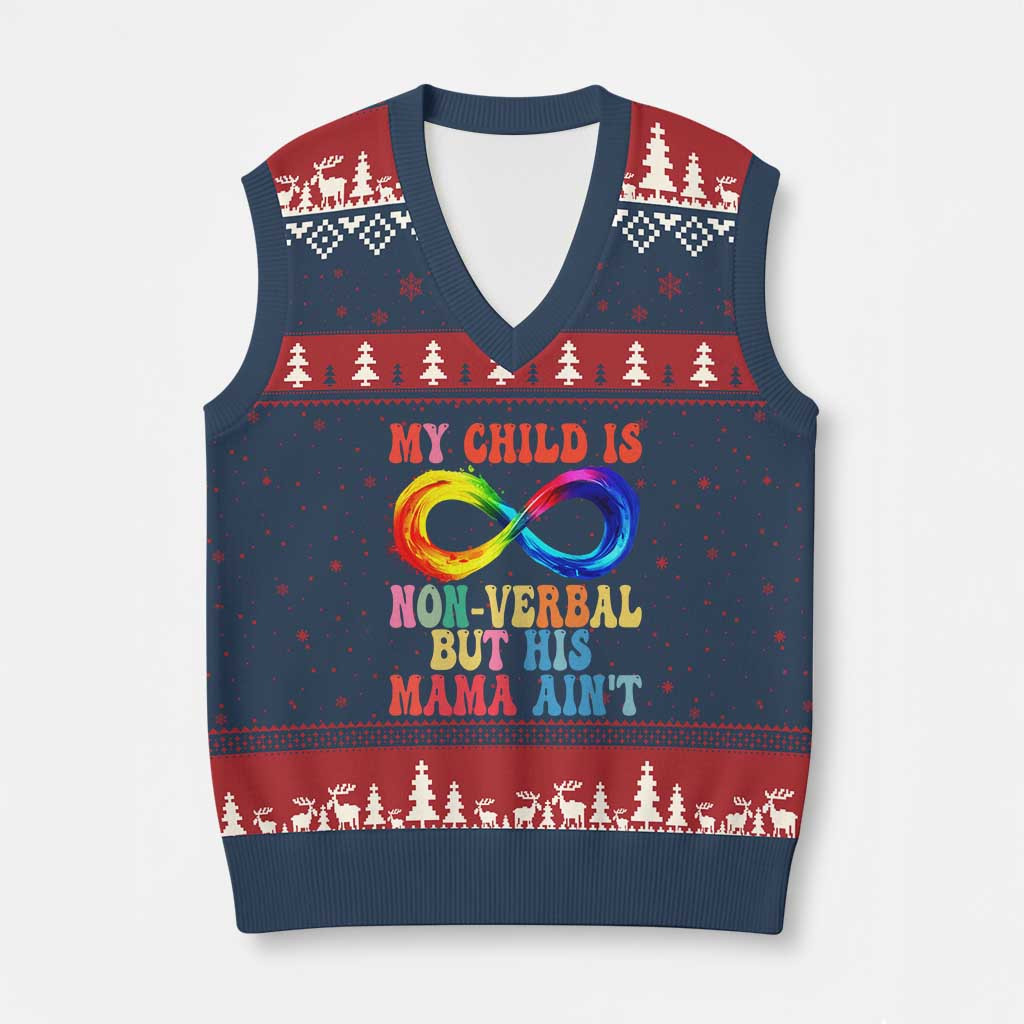 Rushgleam My Child Is Non-verbal But His Mama Ain’t Ugly Christmas V-Neck Knit Sweater Autism Gift