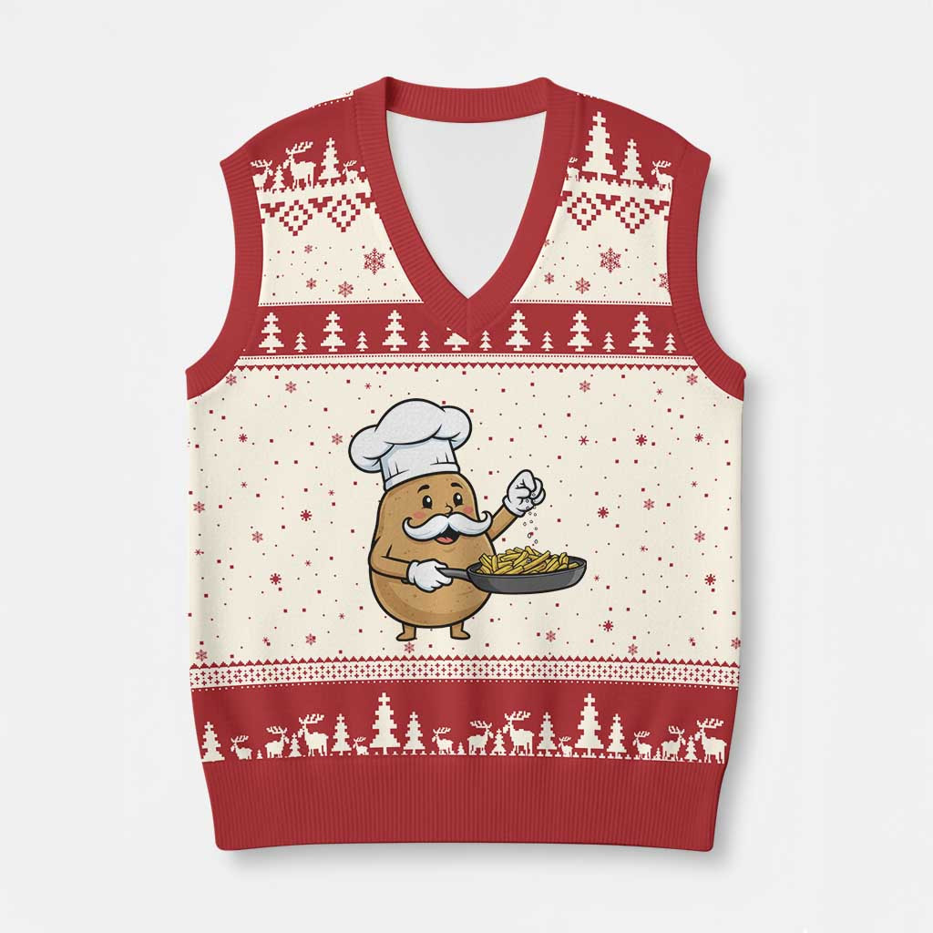 Rushgleam Potato Cooking French Fries Ugly Christmas V-Neck Knit Sweater Vest Food Lover Gift
