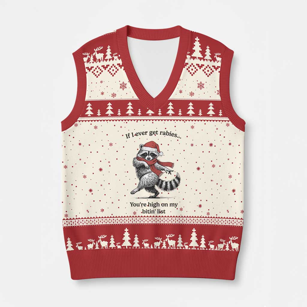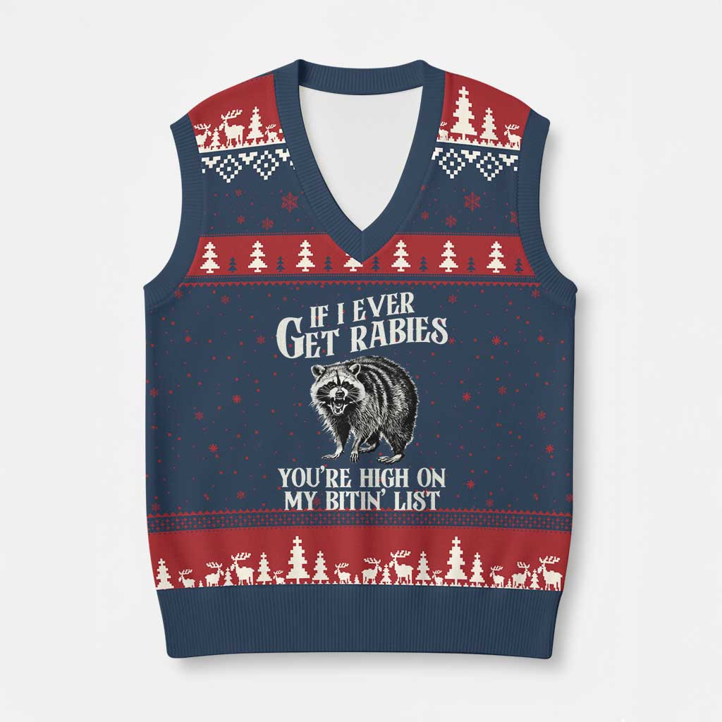 Rushgleam Raccoon If I Ever Get Rabies Ugly Christmas V-Neck Knit Sweater Vest Gift For Raccoon Lovers