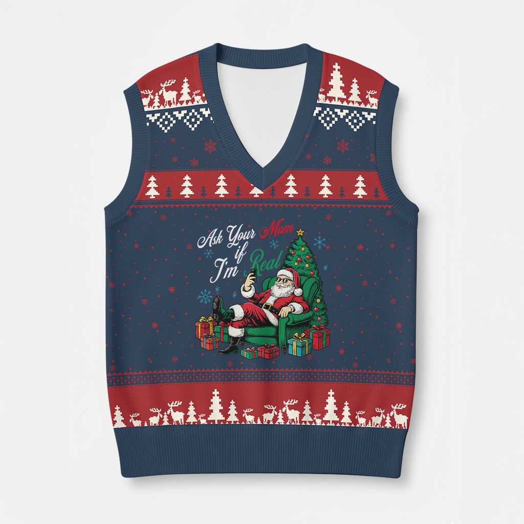 Rushgleam Santa Ask Your Mom If I Am Real Ugly Christmas V-Neck Knit Sweater Funny Dirty Gift For Son