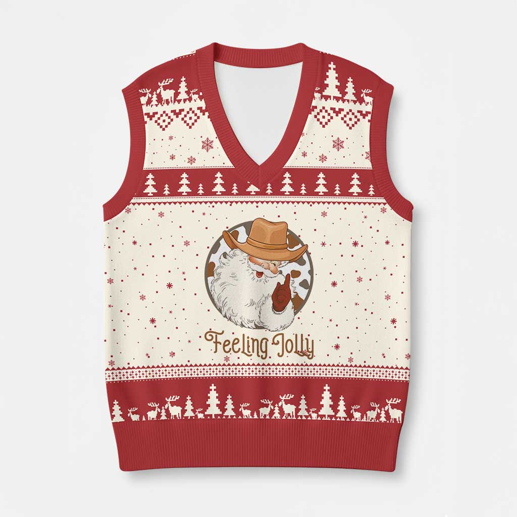 Rushgleam Santa Cowboy Ugly Christmas V-Neck Knit Sweater Vest Feeling Jolly Cute Santa Gift