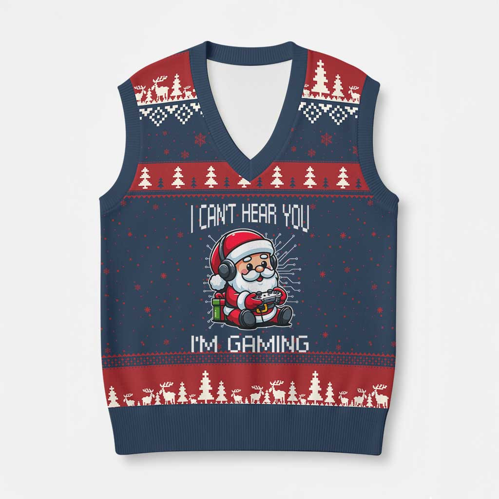Rushgleam Santa Gamer Ugly Christmas V-Neck Knit Sweater Vest Funny Santa Gift For Gaming Lover