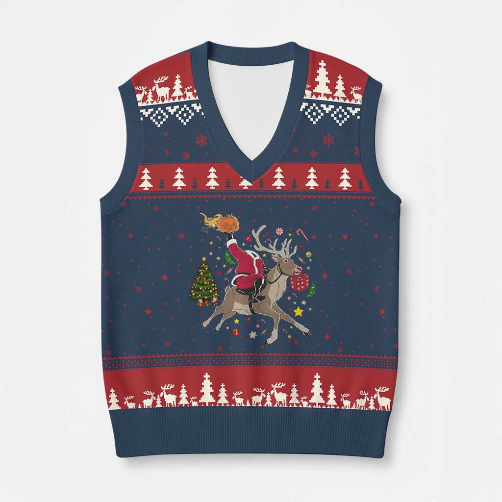 Rushgleam Santa Headless Horseman Ugly Christmas V-Neck Knit Sweater Halloween Gift For Santa Lover