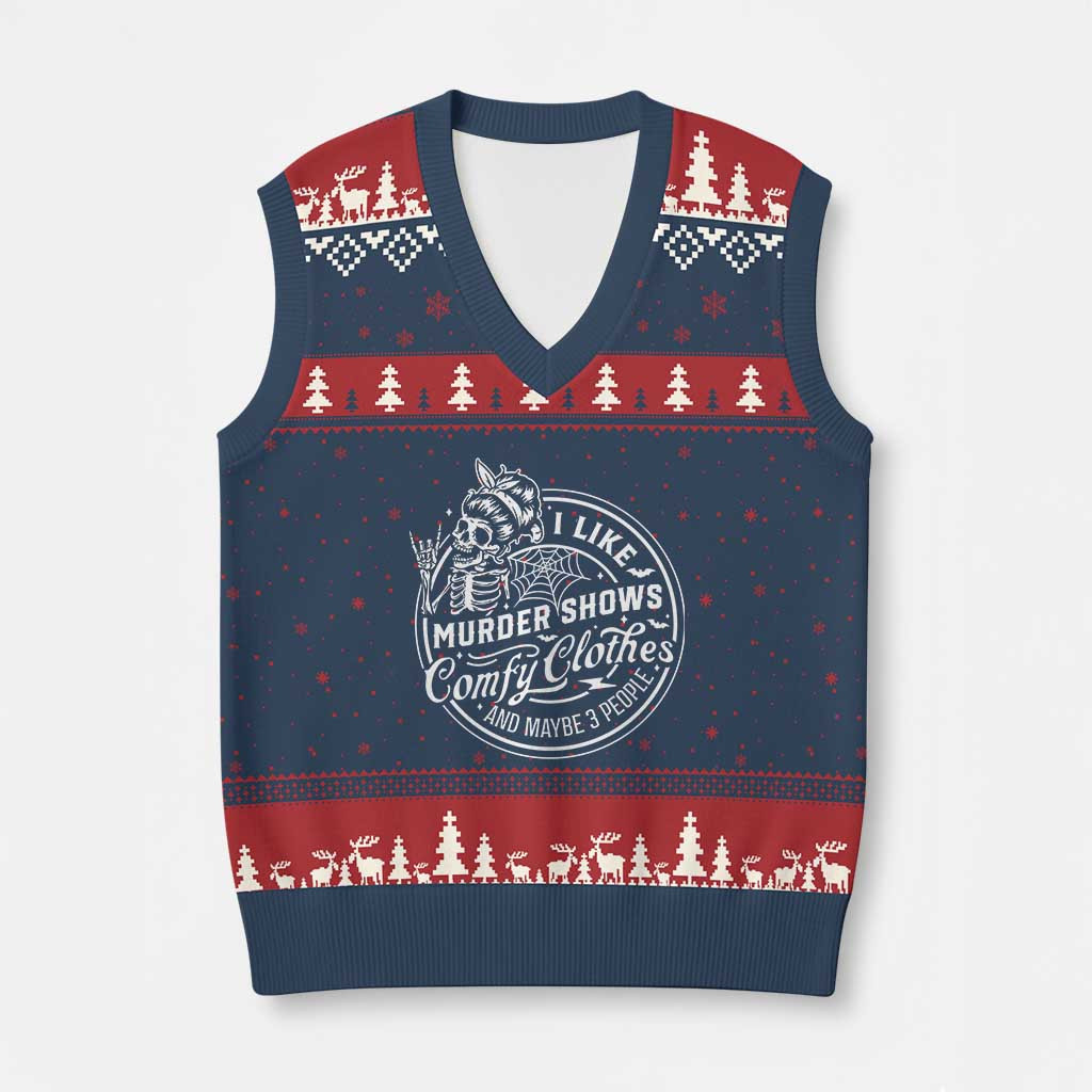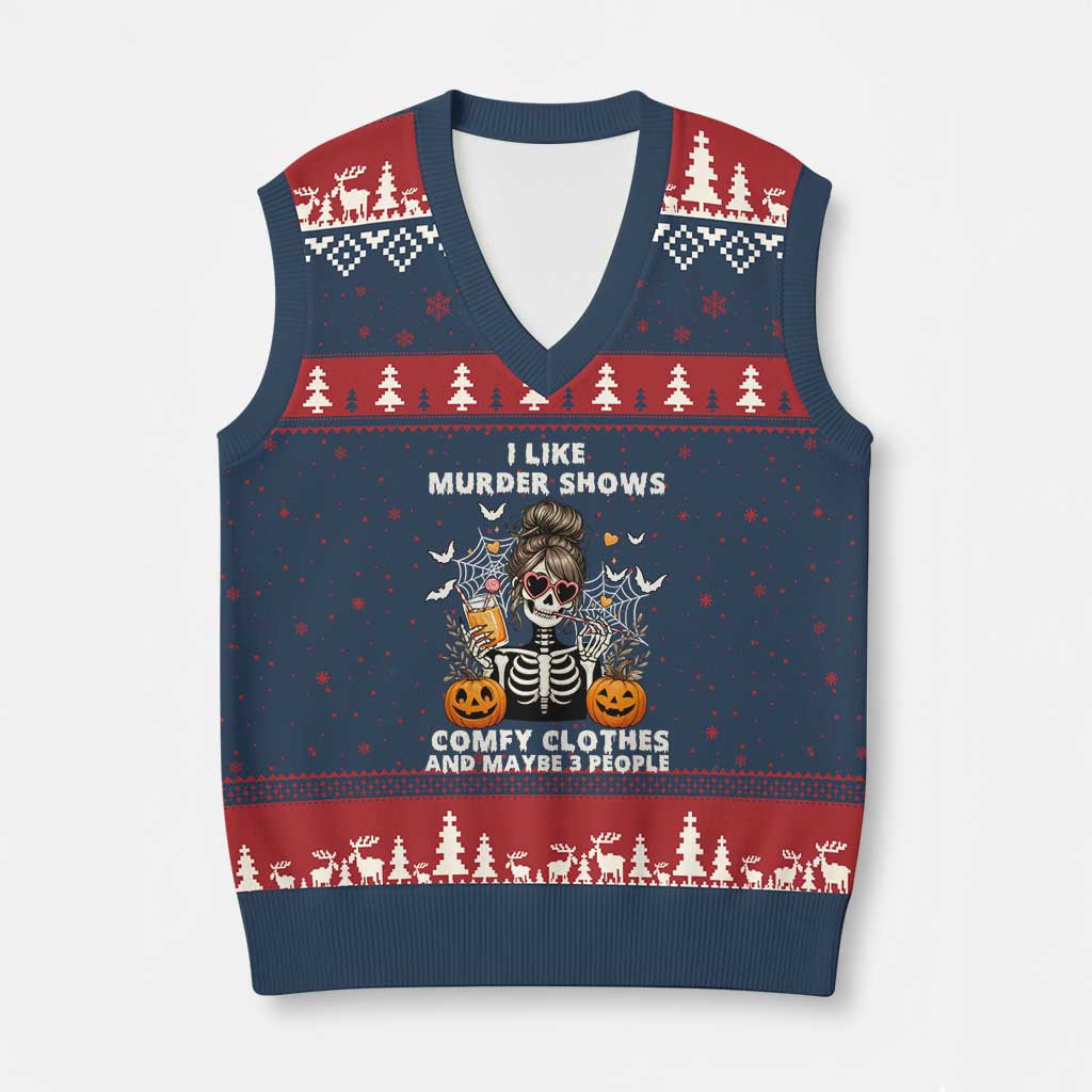 Rushgleam Skeleton I Like Murder Shows Ugly Christmas V-Neck Knit Sweater Vest Halloween Gift For Her
