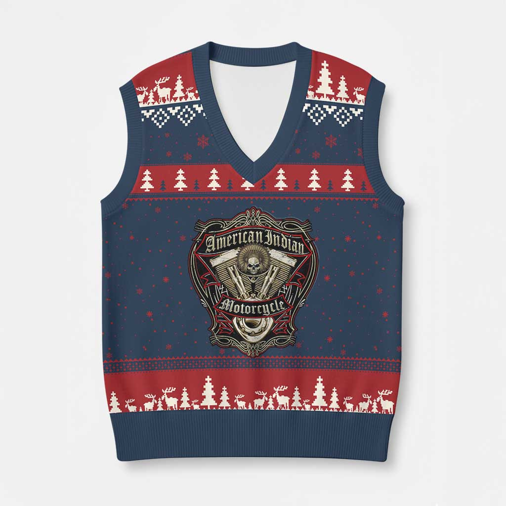 Rushgleam Skull American Indian Motorcycle Ugly Christmas V-Neck Knit Sweater Vintage Motorbike Gift