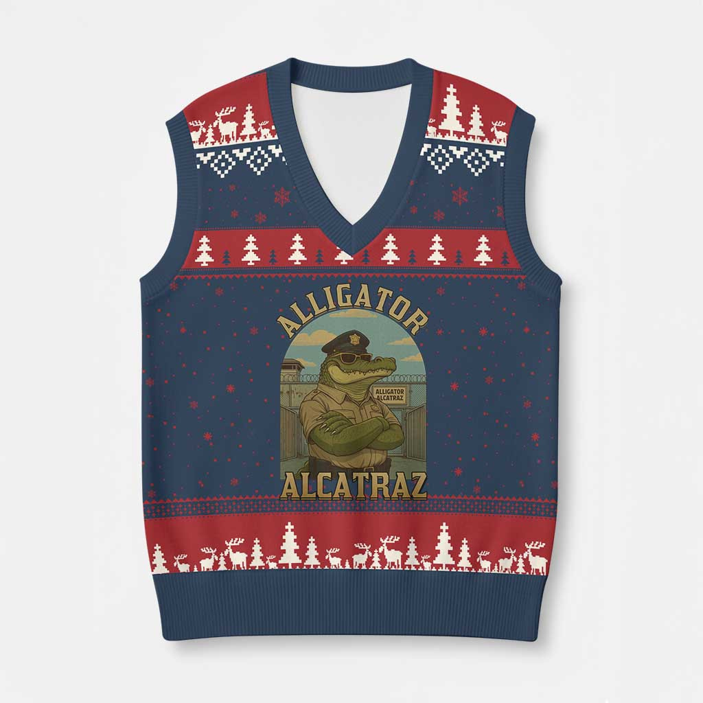 Rushgleam Aligator Alcatraz Ugly Christmas V-Neck Knit Sweater Vest Police Meme Gift For Boyfriends