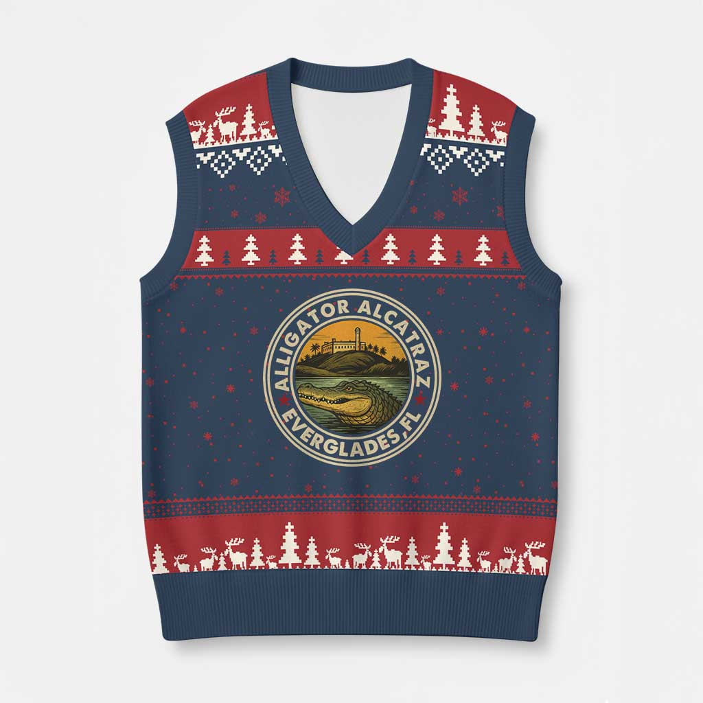 Rushgleam Alligator Alcatraz Everglades FL Ugly Christmas V-Neck Knit Sweater Vest Political Gift