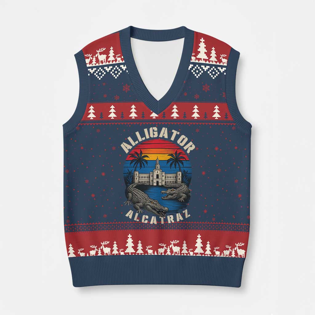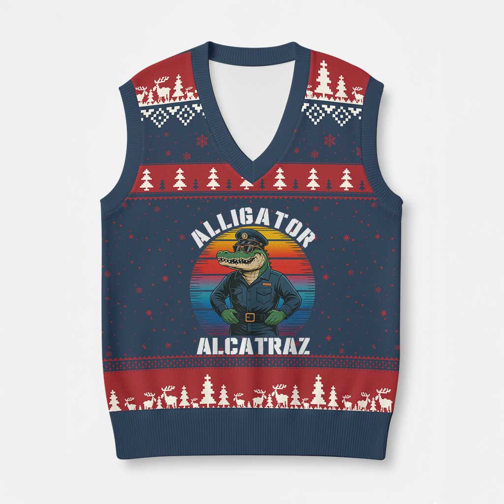 Rushgleam Alligator Alcatraz Political Ugly Christmas V-Neck Knit Sweater Vest Sunset Gift For Her