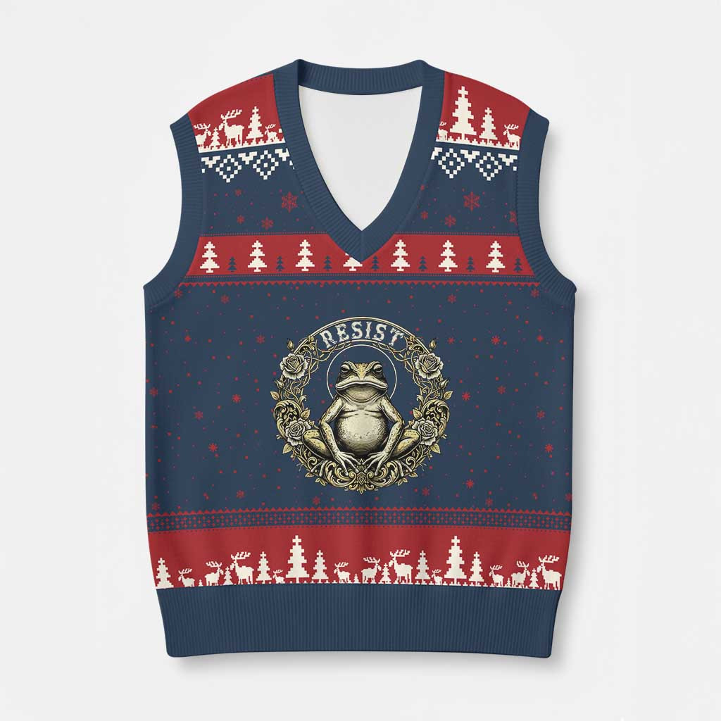 Rushgleam Zen Frog Resist Ugly Christmas V-Neck Sweater Vest Sacred Resistance Protest Xmas Apparel
