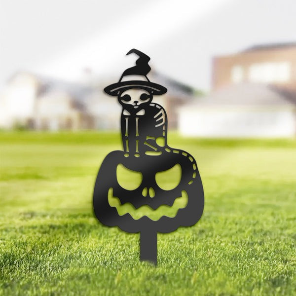 Rushgleam Halloween Black Cat Skull On Pumpkin Metal Yard Signs Outdoor Decor Halloween Gift Ideas